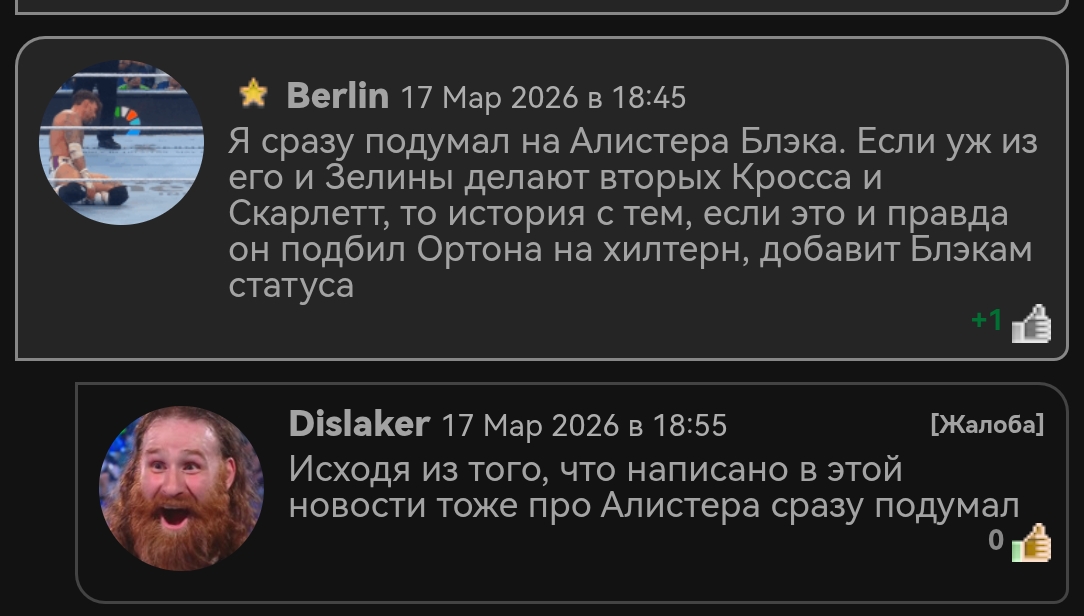 Самого ж Кайзера не было на Мании. Флэра не пускают не из-за этого, а из-за шашней с АЕВ и перфомансов в интернете скорее всего, а это просто повод, чтоб злость деда перевести на Кайзера. WWE запретили Рику Флэру присутствовать на Рестлмании 42 из-за конфликта с Людвигом Кайзером Это как у нас, в России. Под новый год на всяких Чебурашек цены за билет по 1500-3000р. ,естественно там прибыл будет огромная. Та же самая схема. Ивел уже там сколько на контракте сидит без дебюта? В следующем году баттл Андре Гиганта его. Если это передача факела, то Феми пусть точь в точь не списывает. Я только от Брока готов положительно относиться к пятиминутным матчам с тремя приёмами. Как Рейнс Буду Всё Писать С Большой Буквы. В Итоге Макафи Вообще Не Нужен Был В Матче И Его Позвали Только Чтобы Ролл Сделал Приём, А Потом Он Сам Отхватил. Получается, ВВЕ Позвали Местную Звезду, На Которую Вылилась Тонна Хейта И На Которой Провели Пару Приёмов. Успех. Я реслинг относительно недавно смотрю, и Гюнтера лишь по ВВЕ знаю, хотя помню его выступления в НХТ. Инди я не знаю, ТНА или РОХ считается инди? Думаю с большой натяжкой наверное. До ВВЕ я о нём ничего не знал. Но помню что в НХТ у меня о нём было лучше мнение. Заслуги прошлого это хорошо, но то было тогда, а то сейчас. Думаю многие согласятся, что раньше Брюс Уиллис был хорошим актёром, но вот что он превратился потом? У Рипли и Скай уже было трогательное расставание. Посмотрим, сколько оно продлится на этот раз Дарби сказал, что будет ставить титул каждый раз.А что если он поставить MJFу условие, если Дарби победит в их бою то Хэнгмен, не помню имени, сможет в будущем продолжить бороться за титул? Либо AEW делают своего Трика Уильямса. Так главка и не нуждается в дополнительном престиже, в недрах постов на PWN есть замечательная паста от ElRaven на тему значимости титулов, прям советую к прочтению. Главное направление для Дарби - это все-таки потерявший титул Макс, который, несмотря на конфронтацию в начале, перед мейном вышел с наездом к Дарби и даже чуть-чуть закусился с Чампой. А такое количество защит - действительно фишка Дарби с историей про то, что жизнь его нелегкая, а в качестве чемпиона - тем более. Посмотри, какой взгляд был у Дарби, когда Броди ему вызов, это ж прям полная передача духа и настроения его персонажа. Тоже хотел докопаться, но потом решил, что мб перевод не совсем корректный. Ведь англичане (именно этнические англичане, а не все подданные Соединенного Королевства) это, строго говоря, этнически те же немцы. Англосаксонское племя, которое много веков назад мигрировало на британские острова, и подвинули с территории местные кельтские племена (шотландцы, ирланды и валлийцы). Вряд ли, конечно, Флер имел ввиду, особенно учитывая то, что в своей речи он напутал всё, что только мог напутать, но пускай останется здесь как небольшая историческая справка, может кому-то будет интересно. Не верю в ,естноую поддержу Лёши и Бенжамина. Куда и зачем потащили Оспрея большая загадка. Что задумал Мокс? Жду продолжения сюжетной линии. Матч Дарьи Алёна и Томаса Чампы был великолепен. Перевести весь первый день Реслмании. Но если в таком темпе продолжать, то через пару месяцев Алена надо будет собирать по кусочкам. С Чампы сняли петлю с шеи, которую плотно затянул WWE. Начал дышать, раскрыватся. Да и с Бенджамином за ИК неоднократно бился. Админы, не