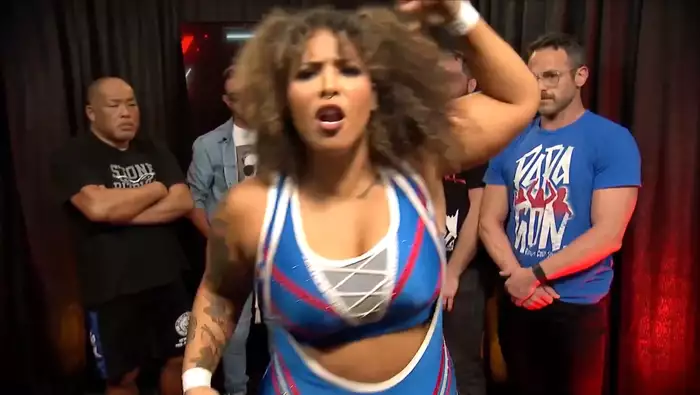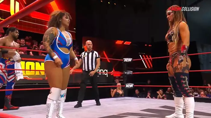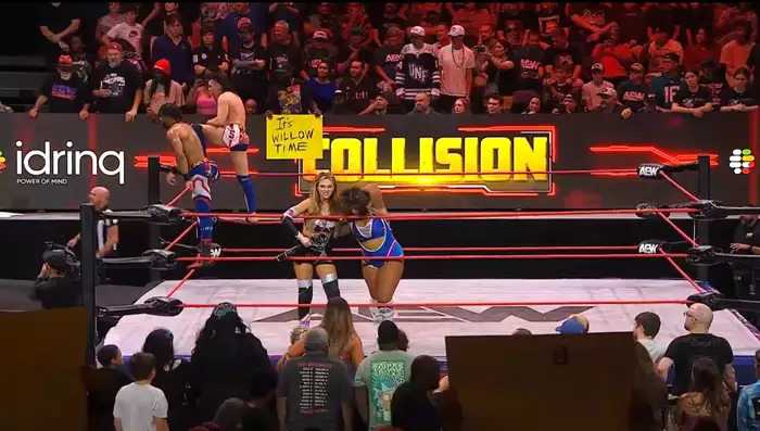 Матч начинают Тони Шторм и Текла, Тони сразу задает нужную себе динамику матча, не позволяя Текла хотя бы встать на ноги. Тони продолжала швырять свою соперницу, пока та не схватила Тони за глаза и не пробила парочку киков по Шторм. Однако этого было недостаточно для перехвата инициатива, Тони снова снесла Теклу с ног, нанесла серию ударов и бекбрейкер на спину соперницы. Тони передала тег Харли, которая, несмотря на непродолжительную потерю инициативы (в результате которой её оппонентки поменялись тегами), все же нанесла несколько успешных атак по Блю, запустила её в угол своей команды и поменялась тэгом со Стэтлендер. Они проводят командную атаку, в ходе которой Крис бросает Харли на лежащую на ринге Скай Блю.
