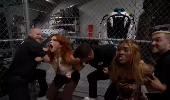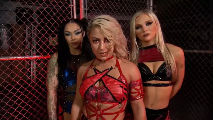 Далее мы снова оказываемся за кулисами. Лекси Нэйр берет интервью у Треугольника Безумия, но его прерывает атака от Джейми Хейтер и Королевы Аминаты. Охрана с трудом разняла девушек, а Хрейтер кричала о предстоящем БЛАД ЭНД ГАТС матче 12 ноября.