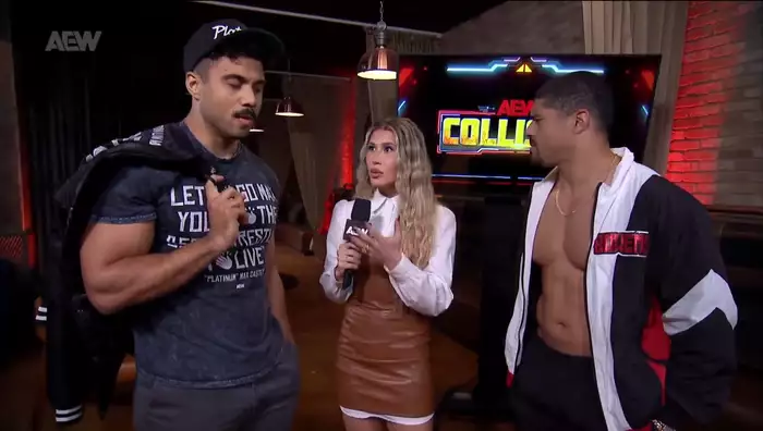 Далее мы снова переносимся за кулисы шоу, где Лекси Нэйр берет интервью у Кевина Найта и Майкла Бейли. Они дали понять, что их дела с ФТР и Стокли еще не закончены, но на Фулл Гир будет гаунлет матч за Национальное чемпионство, в котором и Кевин, и Майк решили поучаствовать, и когда дело дойдет до стычки между ними двумя – пусть победит сильнейший. Далее, как и всегда, продуктивная Лекси Нэйр встретилась с Энтони Боуэнсом и Максом Кастером, чтобы узнать их мнение о поражении в матче с Окадой и Такештой на предыдущем Коллижине.Боуэнс взял слово и с одобрением от Кастера объявил, что Акклеймд никогда не вернуться, они попытались ради уважения к Джерри Линну, но Боуэнсу все надоело, с него хватит. Его первый шаг вперед – выступить на Тэйлгейт Броуле в своем родном штате. Боуэнс поинтересовался, что об этом думает Кастер. Кастер согласился, он тоже рад, что они больше не команда, и он тоже будет Тэйлгейт Броуле и думает, что они там пересекутся. Этот ответ привел лишь к очередному спору между Кастером и Боуэнсом, который попыталась разнять Лекси, приведя несколько любопытных фактов. Со слов Тони Хана, их рейтинги выше, когда они вместе, выше продажи мерча и в целом больше денег для компании от них как командных исполнителей. Цифры не врут, и если они планируют выступить Тэйлгейт Броуле, то лучше бы им это сделать вместе. Кастер и Боуэнс начали было возражать, одна Лекси напомнила, что она всего лишь «гонец» и «не надо в нее стрелять». Кастер, смотря прямо в камеру, обратился к Тони Хану с вопросом: правда ли он о Кастере так думает? Представляет ли он, как это оскорбительно? И вообще Хан обязательно пожалеет, что так с Кастером обошелся, потому что нельзя вести себя так, будто люди не любят ЗЕ БЕСТ РЕСЛЕР ЭЛАЙВ и будто именно Боуэнс в одинчоку представляет компанию на всех сторонних мероприятиях, который вообще не лучший реслер на свете. Боуэнс был в ярости, он начал кричать Кастеру, чтобы тот заткнулся, но в то же время и согласился: Боуэнс прав на счет Тони Хана, что с ним не так? Пускай отменит матч, а с Боуэнса все, хватит, крича, он ушел. Кастер добавил, что он тоже закончил.
