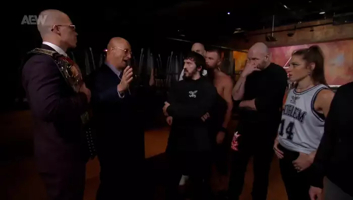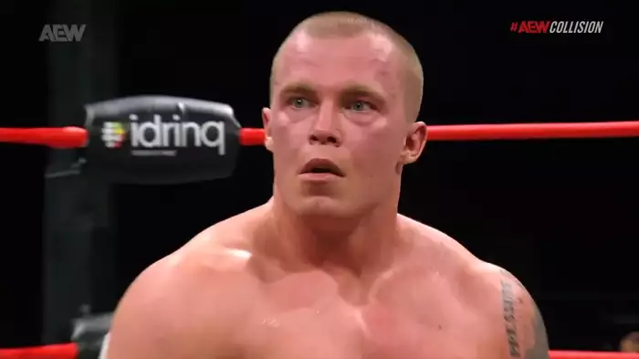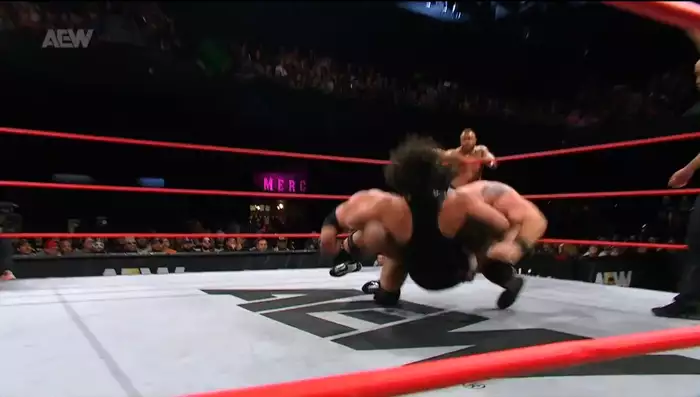 После Родерик отвлекается на Марину Шафир, чем пользуется Джон и тычком бьет по глазам Родерика. Бойцы возвращаются на ринг, и Мокси начинает таргетированно работать уже над ногой Стронга, с начала пробив дроп киком, а после взяв ногу в болевой, после еще раз пробив дроп киком и еще раз взяв в болевой – Родерик спасается благодаря канатам. Однако Мокс продолжает давить и, в конце концов, проводит батерфляй суплекс с верхнего тернбакла с последующим удержанием до двух. Однако это только зарядило Стронга, он ожил и начал пробивать Джона серией сильнейших ударов как руками, так и ногами, а закрепил он это все красившим броском с последующим удержанием до двух. Стронг провел тайгер драйвер – снова удержание до двух, он сразу же захватил Джона стронг холд, но том смог перевести болевой в сворачивание до двух. Бойцы продолжили обмениваться ударами, но Стронг снес Джона смачным дроп киком, после которого отправился на верхний тернбакл и провел суперплекс. Стронг продолжил атаковать, одна Шафир схватила его за ногу, это заметил судья, и пока тот отвлекся, Джон попытался воспользоваться преимуществом. В это же время к рингу выскакивает Уиллер Юта и сносит подоспевшего на помощь своему товарищу Кайла О’Райли. Джон отправляет Родерика за пределы ринга, чтобы там Юта мог ударить его стулом, однако это видит реф и выгоняет из рингсайда и Юту, и Шафир. Это суматохой пользуется одетый в одежду ПАК и пробивает Родерика сильнейшим ударом ногой. Реф ведет отчет, т.к Родерик лежит за пределам ринга, но он находит в себе силы вернуться, но только для того, чтобы получить кербстомп от Моксли и удержание до двух. Джон захватывает Родерика в очередной болевой, но тот спасается, положив ногу на канат. ПАК вытаскивает стол, реф недоволен, следом Мокс пытается провести пайлдайвер на стол, Стронг отбивается, в это время О’Райли вырубает ПАКа, но у рингсайда заспавнился очередной участник Всадником Смерит – Дэниел Гарсия, но только для того, чтобы самому стать жертвой ураганного броска от Стронга на тот самый заклятый стол. Тем не менее, Джон на ногах и бьет Родерика головой об стойку ринга. Джон пытается провести парадайгм шифт на стальные ступени, но вместо этого сам получает фулл нельсон об стальные ступени. Родерик вернулся на ринг, пока реф вел отчет, Моксли попытался сделать то же самое, однако его ногу из-под ринга схватила чья-то рука … и это победа Родерика Стронга из-за дисквалификации Джона по отчету! Победитель: Родерик Стронг Подоспевшего ПАКа бьет шокером некто из-под ринга, коим оказывается Дарби Аллин! Стронг не отстает и сшибает Уиллера Юту дроп киком! Победа в этой схватке на стороне Конгломерата и (не)участника Конгломерата Родерика Стронга! На этом моменте шоу выходит из эфира.Картинка 18, Дарби и электрошокер. Оценка шоу: 8/10 (автора) Крепкое шоу, у которого из больших минусов – сквош (даже если он чем-то обусловлен, это все равно моветон), отсутствие каких-то глобальных шагов в продвижении сюжетов и отдельная претензия касательно Марка Бриско: куда он пропал перед БЛАД ЭНД ГАДС матчем? Я помню, что еще комментаторы на Динамите обратили на это внимание, но пока не уверен, что это часть сюжета, а не букинг-ляп. Тем не менее, Коллижен продолжил заданную на Динамите линию и окончательно сформировал подводку к грядущим БЛАД ЭНД ГАДС матчам. Касаемо м