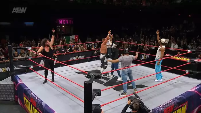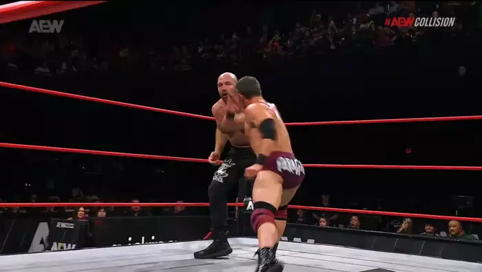 Приветствую всех на очередном запоздавшем обзоре Коллижена! Сегодняшний выпуск, как и прошедший Динамит, в основном посвящен подготовке к БЛАД ЭНД ГАТС в лице 3-х матчей за преимущества в клетке, однако на него неожиданно анонсировали еще несколько интересных и неожиданных вывесок. В общем, выпуск должен быть интересным, так давайте же скорее это и проверим. Шоу сходу стартует с матча, причем матча неожиданного. Джус Робинсон и Остин Ганн против Дэкса Харвуда и Кеша Уилера Матч начинают Остин и Дэкс, однако последний быстрого передает тег своему напарнику. Его в свою очередь Остин пару раз успешно ловит на арм драг, а после передает тег Джусу (в это же время Кеш возвращает тег Дексу). Эта пара тоже начинает фестиваль бросков, и Декса также арм драгом укладывают на настил. Однако Харвуд не растерялся и схватил Джуса за волосы, тем самым не много затормозив оппонента и завладев преимуществом. Декс было начал успешно пробивать чопами загнанного в угол Джуса, но не тут-то было, ведь Джус отвечает взаимностью! Он меняется местами с Дексом, начинает дубасить его чопами, встает на канаты, начинает дубасить с канатом и даже выполняет что-то вроде кросс бади в подоспевшего на помощь напарнику Уиллеру. Джус и Остин проводят командную атаку, и с которой выходят победителями, но ненадолго: Кеш все-таки подловил Джуса, пока тот отвлекся, и начал таргетированно атаковать его ногу. Джус пытается отбиваться сразу от обоих оппонентов, однако в моменте ему удается реверсировать командую атаку ФТР и провести им двойное ддт!