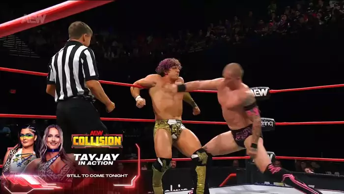 Следом снова неожиданный и потенциально интересный матч как раз при участии Кайла Флетчера. Кайл Флетчер против Эйса Остина Матч начинается соревнованием в ловкости между соперниками, и первым на сворачивание до двух выходит Остин. Эйс показывает Кайлу, что ему не хватило всего чуть-чуть для победы, Кайл в ответ уходит прогуляться вдоль ринга и пообщаться со зрителями. Реф ведет отчет, поэтому Кайл все-таки поднимается на ринг и сшибает биг бутом потерявшего концентрацию Остина. Кайл хочет совершить еще одну атаку, но Остин ее перехватывает, выставляет подсечку и пробивает киком упавшего Флетчера, после чего проводит еще одно сворачивание до двух. Кайл встает, но сразу получает дроп кик от Остина. Эйс пытается закрепить успех, бьет Кайла чопами, пытается провести кросс бади с третьих канатов, но его перехватывает Флетчер и проводит связку из бэкбрейка и фулл нельсон слэма. Кайл начинает уверенно доминировать в матче, издевательски избивая Эйса.
