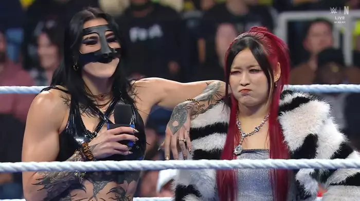 Рия говорит, что они не пойдут одни. Они выводят двух своих напарниц - Шарлотт Флэр и Алексу Блисс!