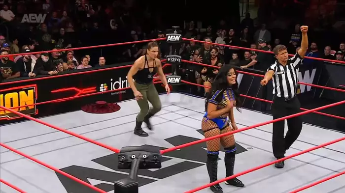 Матч начинается с того, что Валькирия понимает, что ей шляпу негде повесить в этом долбанном матче, Мэло сразу сшибает её киком и начинает забивать в углу. Однако Валькирии удается успешно отбиться, но ненадолго, ведь Мэло запускает её в стальные ступеньки. Пока партнеры по MxM TV помогали Валькирии прийти в себя, Мэло взобралась на верхние канаты и спрыгнула оттуда на самых красивых людей в AEW воих оппонентов – весь удар приняли Джони ТВ и Мансур. Мэло пробила киком Мэйсона, следом – сразу же пробила киком Валькирию, отправила ее на ринг и провела тай-ко с последующим победным удержанием до трех.