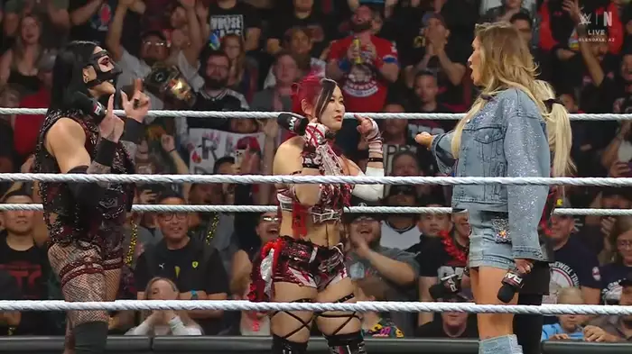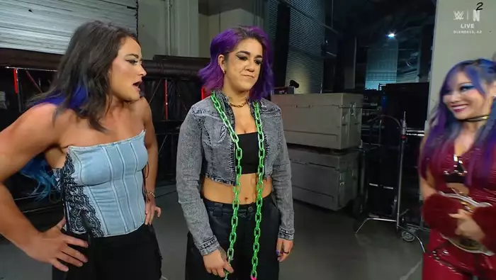 Адам Пирс стоит с Бэйли и Лайрой, первая просит дать им шанс побороться за титулы командных чемпионок. Пирс спрашивает, в правильном ли психологическом состоянии Бэйли, чтобы иметь дело с нынешними чемпионками. Валькирия подтверждает, что они в порядке. Девушки прямо просят матч. Пирс отвечает, что после главного события вечера картина прояснится, и их запрос будет рассмотрен. В этот момент появляются Аска и Каири Сэйн. Аска говорит Бейли прямо в лицо, что если бы та тогда осталась с ними, они бы до сих пор были чемпионками. Обе называют Бэйли идиоткой. Бэйли отвечает, что идиотки как раз они. Аска парирует, говоря, что она - чемпионка, а Бэйли - никто. Кто сегодня в главном событии? Шарлотт Флэр. Не Бэйли. Каири протягивает Бэйли свою цепь, Аска опять окликает Сэйн вдалеке. На этот раз Каири почти не пугается.