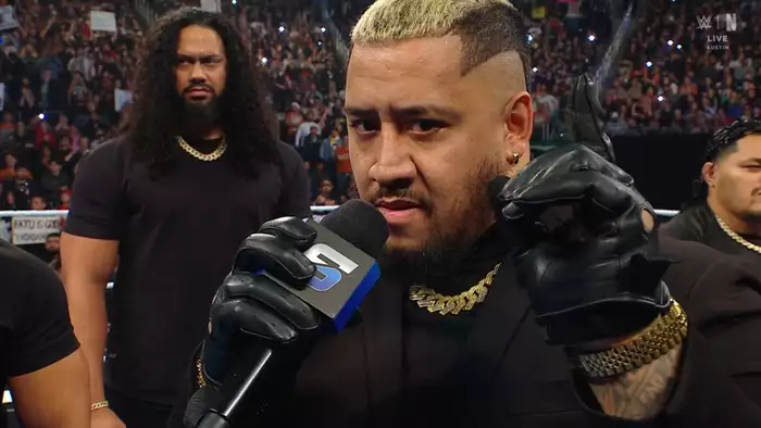 Тем временем к рингу направляется Соло Сикоа в сопровождении своих парней, в этот раз без фейспейнтов.
