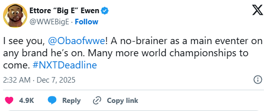 Биг И в соцсетях отреагировал на выигрыш Оба Феми чемпионства NXT, заявив, что он станет мэйн-ивентером на любом из брендов: