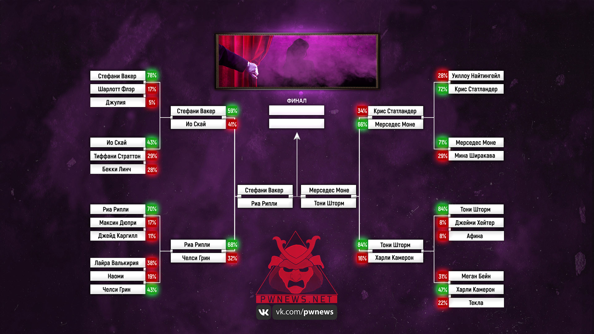 Очень жаль, что скорее всего Панк проиграет Сине. В финале думаю Сина выйдет лучшим. С женским немного сложнее. От всей души желаю победы Вакер, весь год была на виду и показывала очень хорошие. Что касается Тони она ничуть не отставала от Вакер, но лучше чтоб победила Вакер