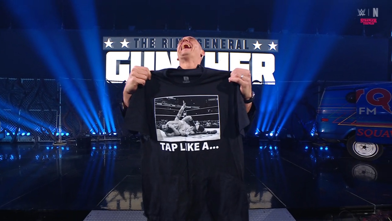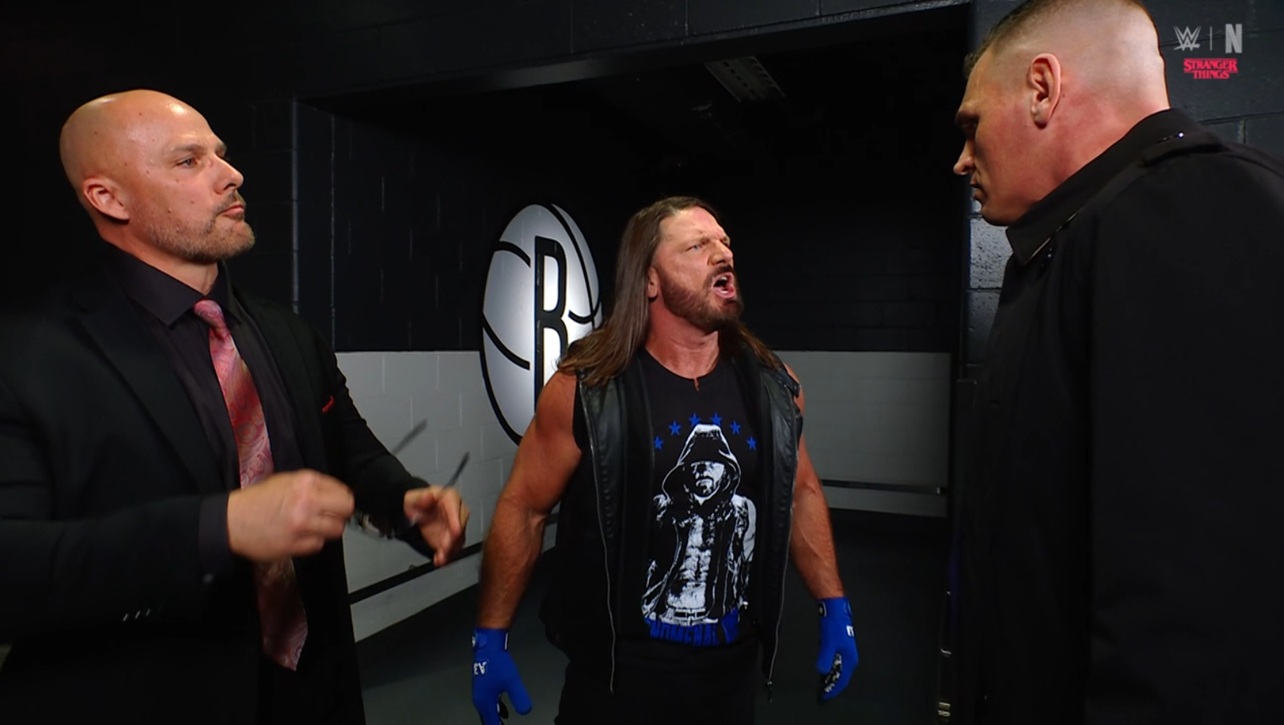 Гюнтер продолжает, что если Стайлз хочет говорить об уважении, то он явно лезет не в свою весовую категорию. Все знают, что Гюнтер - величайший рестлер в этой компании. Включая самого ЭйДжея. Гюнтер - это тот человек, который заставил Джона Сину сдаться, как маленькую... Ну, Стайлз знает кого. ЭйДжей хочет что-то сказать, но Гюнтер громко смеется и завершает фразу: КАК МАЛЕНЬКУЮ СУКУ! Гюнтер говорит, что теперь остается один вопрос: что собирается делать по этому поводу маленький ЭйДжей. Гюнтер показывает ЭйДжею жестом, что тот даже не дотягивается до его уровня, и спрашивает, что тот будет с этим делать, после чего показывает таунт Сины перед его лицом. Стайлз дает Гюнтеру пощечину, Гюнтер злится и они встают лицом к лицу.