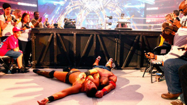 Потом выходит Сина. Я помню момент, если так можно сказать, реакции, хотя это даже не была реакция, я там просто избивал его в углу. Помню как кричали люди, когда я вырвался из AA. Помню, как Сина говорит мне: «Держись за канаты, парень, держись за канаты. Мы с тобой». Бум! Вижу Рока. Еще раз бум! Помню, как Чиода кричит: «Удерживай его, парень, быстрее удерживай его». Я вообще не понимаю, что происходит. 1, 2, 3 и победа. Чиода говорит мне: «Брось титул в Рока. Брось титул в Рока». Я типа: «Ладно», и бросаю титул. Помню, как Рок подходит ко мне и говорит: «Я с тобой, парень. Не переживай. Мы справимся»