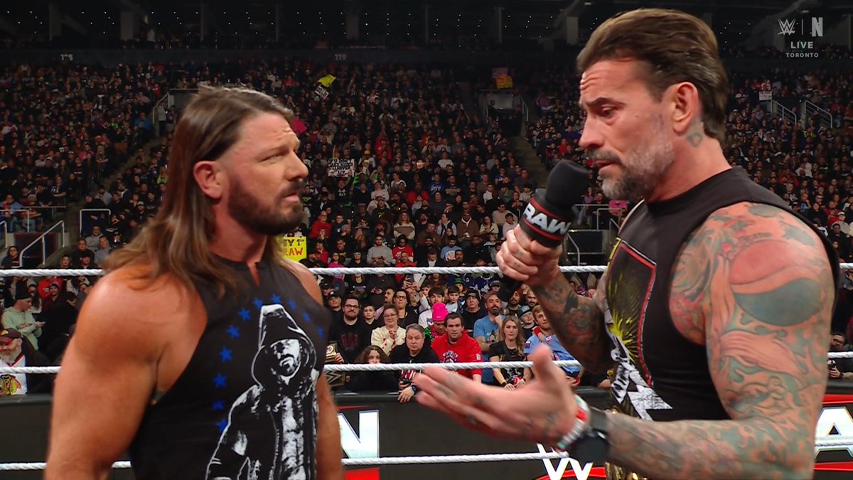 Стайлз спрашивает, неужели СМ Панк думает, что он не сможет победить Гюнтера? СМ Панк отвечает, что не это имел в виду. ЭйДжей говорит, что именно это подразумевается. СМ Панк напоминает: они видели, как ЭйДжей победил Гюнтера, но руку поднял рефери. Если в субботу Стайлз не выиграет, они никогда не увидят матч СМ Панк против Стайлза в ринге WWE. СМ Панк оглядывается вокруг. ЭйДжей говорит, что знает, СМ Панк не хотел сказать именно так, но это звучит неуважительно. СМ Панк отвечает, что ведет себя эгоистично. Стайлз говорит, что знает, он может победить Гюнтера и знает, что может победить Панка. Панк отвечает: "Вот оно". Трудно дважды победить хорошую команду. Если ЭйДжей проиграет в субботу, он уже не сможет доказать, что способен победить СМ Панка. СМ Панк иронично добавляет, мол, боже мой, что же ему теперь делать. Стайлз предлагает провести матч сегодня вечером, переставая ходить вокруг да около. Если он победит Панка, а потом Гюнтера, то станет претендентом номер один на этот титул. СМ Панк обращается к Стайлзу и публике Торонто, говоря, он завоевал титул 1 ноября и обещал быть боевым чемпионом. Если они собираются драться сегодня, то это будет за пояс.