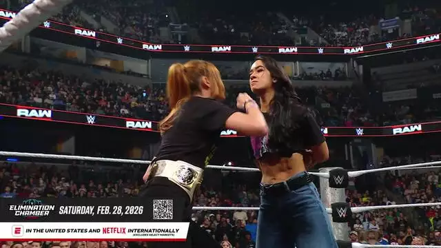Звучит музыка Бекки Линч, и она выходит к рингу. Бекки спрашивает, неужели ЭйДжей думает, что это шанс на тайтл-рейн? Она спрашивает, что это вообще такое. Это шанс собрать всех друзей и семью в Чикаго, чтобы устроить ей прощальный матч и проводы, которых у нее никогда не было и которых она никогда не заслуживала. Пусть они проливают слезы, пока Бекки отталкивает ее катафалк. Дивизион существовал до ЭйДжей и существовал после. Бекки говорит, что она делала историю, пока ЭйДжей рисовала комиксы. Если ЭйДжей пройдет через Elimination Chamber, то сможет порассказывать о том единственном разе, когда они встретились один на один. Ли предлагает отложить титульный матч до Чикаго. Она приглашает Бекки войти в ринг и прямо сейчас помахать кулаками. Просто ради забавы - почему нет? Бекки снимает пальто и начинает ходить взад-вперед у ринга. Бекки спрашивает, неужели она выглядит глупо в глазах ЭйДжей? Она знает, что Ли ударит ее исподтишка. Претендентка отвечает, что никогда так не сделает, и поскольку Бекки любит чипшоты, пусть Бекки нанесет первый удар. Линч заходит в ринг. ЭйДжей говорит ей бить и заводит руки за спину.