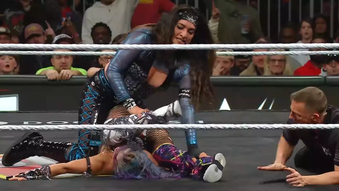 Ийо Скай выходит на ринг, следом Каири Сэйн и Ракель Родригес.