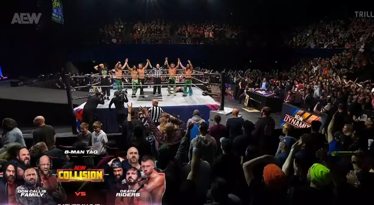 The Demand нападают на Джека Перри прямо во время его выхода к рингу. Начинается потасовка, после которой все участники матча выбегают к рингу. Они продолжают драться под музыкальную тема Джека Перри, и это всё выглядит как настоящий хаос. Спустя несколько минут музыка Джека Перри наконец-то заканчивается, но эту драку уже не остановить. Вся толпа бьется как на ринге, так и за его пределами. После рекламной паузы ситуация не изменилась. FTR боролись с Янг Баксами, в то время как Раскалзы сосредоточены дракой с Demand. Джек Перри достает под рингом пылесос и начинает использовать его как оружие, а после мешком с пылью бьет одного из соперников. Он выходит на удержание Бишопа, но тот вырывается. Рикошет готовил атаку с третьего каната, но получил мусорным баком в голову от Янг Баксов. В целом, поединок в таком хаосе продолжался до самого конца. Из интересного в конце можно отметить, как Тоа Лиона получил групповой суперкик от всех, а также один из финальных разменов, где команда Рикошета была близка к победе. В конце Джек Перри удержал Рикошета после того, как тот принял BTE Триггер.