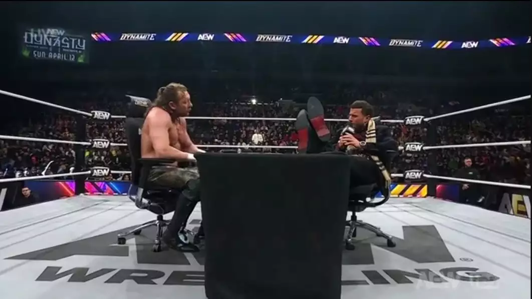 Туда уже выходит MJF для подписания контракта на свой матч. Следом выходит Кенни Омега. Они садятся друг напротив друга, и сначала все идет спокойно, но Омега перебивает Макса, проходясь по его привычке постоянно говорить. Кенни говорит, что здесь выступают лучшие, вспоминает недавние проблемы со здоровьем и благодарит фанатов за поддержку, потому что они хотят видеть чемпионом кого-то лучше, чем MJF. Он никогда не называл себя чем-то большим, чем рестлером, но если Фридман зовет себя «дьяволом», то, возможно, он станет «богом рестлинга». MJF смеется, подкалывает Омегу за слова о форме на сто процентов, шутит про канадцев и заявляет, что Кенни отделяет от завершения карьеры один сильный порыв ветра. Но затем он предлагает перейти к тому, о чем Омега не хочет говорить. Он заявляет, что Омега недавно был у врача, и тот четко дал понять, что его дни в ринге сочтены из-за дивертикулита. И когда MJF победит его на Dynasty, фанатам придется признать, что их «бог» всего лишь человек… причем человек, который видимо предпочел бы смерть.