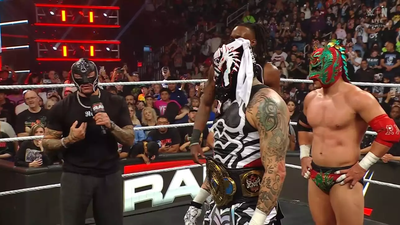После матча рестлеры празднуют победу, как тут... звучит музыка Рея Мистерио! Ветеран выходит к рингу.
