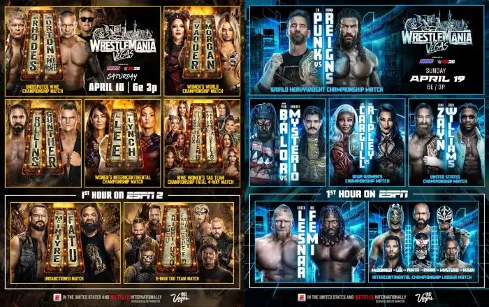 Цитата WWE объявили открывающие матчи каждого из дней WrestleMania 42. В субботу PLE откроет командный матч Усо и ЛА Найта против Vision и IShowSpeed, а воскресенье матч Брока Леснара против Оба Феми.
