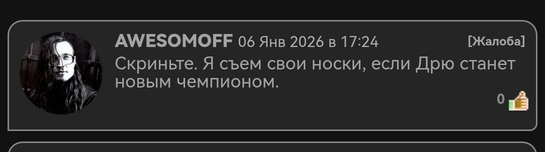 Весь сайт молился за тебя и молитвы были услышаны!! Дрю Макинтайр: Я молился об этом, и это случилось Думаю, жена простит ему, если ближайшие ночи он будет спать с титулом. Она тоже молилась на титульную смену, женщина понимает Судя по списку, ощущение что тёрнуться должен Джимми, а не Джей, потому что ну эллиминирование из баттл рояля, истерические позывы, надменность - это всё вот куда-то ушло, а осадочек вроде как остался Саудиты хотят купить Рока и Стива Остина. А хотят ли они купить им не знаю костыли или каталки или санаторий с элекрофарезом или увидеть, что АТТИТУДА УЖЕ НЕ АТТИТУДА АЛЁ? Ну так у Леснара и образ по-другому построен. "Пришел, увидел, победил" против Роудсовского "пришел, долго превозмогал и наконец победил". Одно дает карт-бланш на любые тайтл-шоты, другое заставляет выстраивать долгий билд-ап к чемпионству, что само по себе кардинально расходится с графиком парт-таймера. Если в этот матч Рока и Стива Остина вновь вмешается Винс со стулом, то я бы даже глянул. Ну как будто бы Кидд более успешный и перспективный парень. Пасха ещё не скоро, а Усо уже воскресли. И ведь сейчас проходит хаус-шоу в Шотландии, крутой подарок им конечно сделали Ну и как Мака вообще можно букать?) Затем же, зачем и Гейб Кидд Очень рад за опасного поцыка. Выстрадал эту победу своими стараниями и мочеиспусканиями. Впервые за долгие годы похвалю Папу Эйча. Это было действительно неожиданно и прям очень хорошо. Даже все предыдущие сливы Дрю обрели смысл. Поучился эталонный путь андердога к успеху. Только андердог двухметровый и к тому же хил, что делает историю еще более оригинальной. Но блин, в чем проблема дать более уверенную победу. Ну вы уже решили снять пояс с превозмогателя. У вас будет новый чемп. Так сделайте его победу уверенной, чтобы и рейн ощущался соответственно. Ну ок, первое удержание после лоу блоу. Но второе сделайте нормальным. А вместо этого третьей стадией идет самый ублюдский тип матчей. Серьезно, назовите хоть одного человека, которому нравится это идиотское условие матчей в клетке, где для победы надо просто вылезти. Причем можно и через дверь. Это не третья стадия ада, а попытка побега из вытрезвителя. Причем то, как нелепо пытаются рестлеры убегать, лезут на вершину клетки, когда дверь в метре от них, а после финишера пытаются удержать, вместо того, чтобы за пару секунд покинуть клетку, это отдельная тема. Эти условия напрочь лишают матч нерва. Но даже с такими условиями все равно положительные эмоции получил. Теперь надеюсь на длительный рейн у шотландца. Надеюсь, что третья часть нудятины от недовождя и проевозмогателя на РМ пройдет без пояса. А еще лучше без эфирного времени, пусть просто на парковке потолкаются. Ну а возвращение Фату просто кек. Прям демонстрация мема про слабоумие и отвагу. Только без отваги. P.S. Количество комментов в новости такое, как будто в матч вмешался Итмен, а не Фату. Ничего сейчас Сэми Зейн Рамбл заберет, а после и титул у Дрю на Рестлмании. Вот и будет арабская сказка Видео с носками где? Аллилуйя,твои молитвы были услышаны, ДрюМак❤️ Ещё лет 5 и саудиты оплатят Стинг по Гробовщика матч столов, лестниц и инвалидных колясок Дрю забрал 2026 год, можете больше не проводить шоу, лучше уже не будет Ну какой красавчик!!! то чувство когда пара постов Дрю в соц. сетях уже в разы интереснее, чем все рейны Коди xD ты про юз